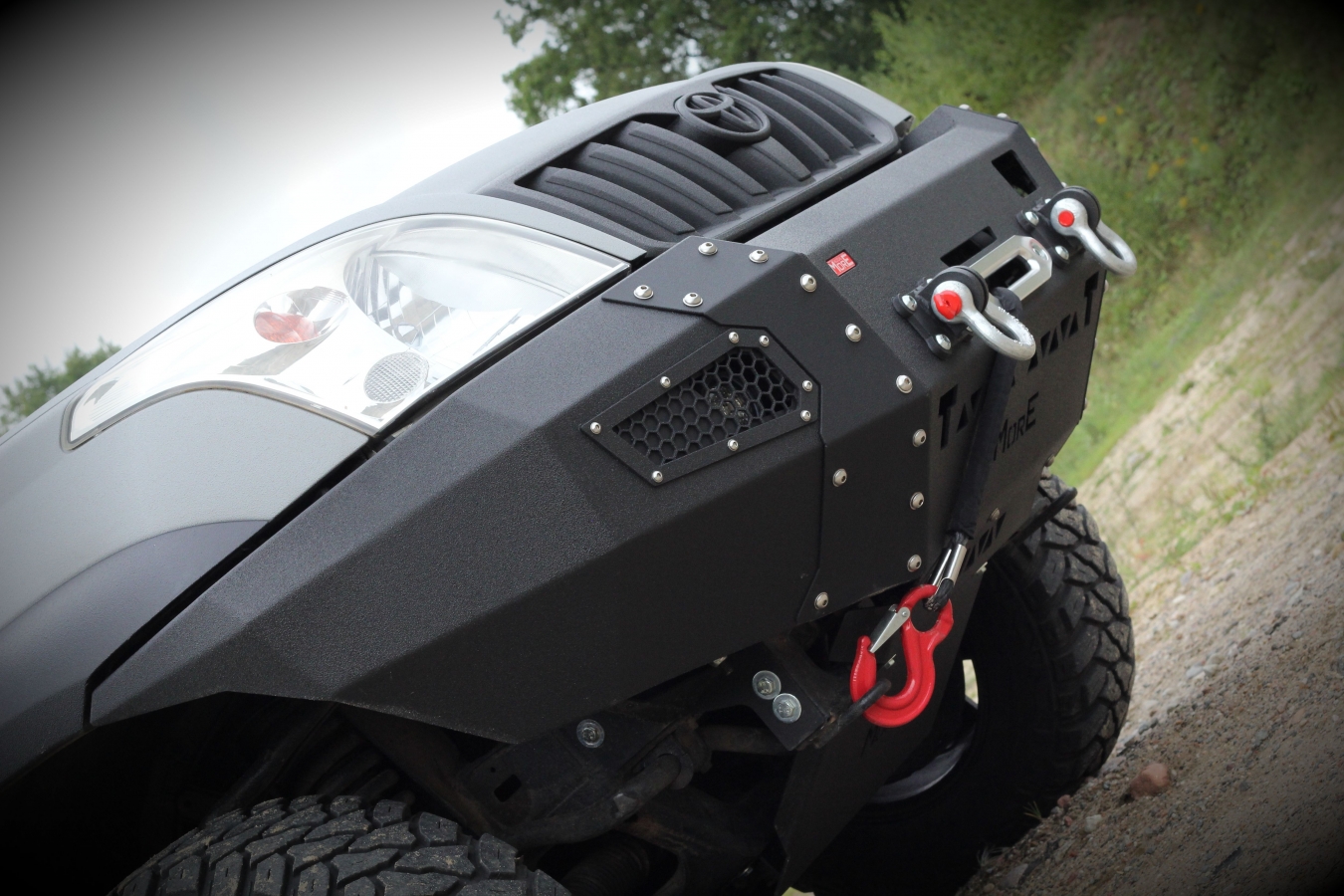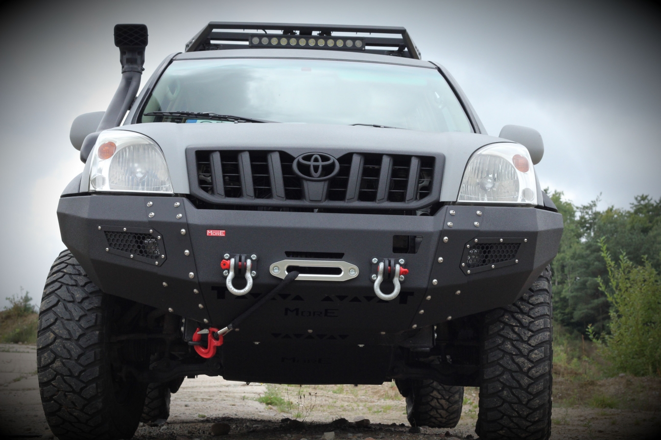 Bara protecte fata pentru Toyota Land Cruiser 120/125, cu suport de troliu incorporat. Bara de la MORE 4×4 este din otel si este vopsita cu vopsea structurala de culoare neagra, similara Raptor Coating. Este o bara solida cu o forma apropiata de cea originala, dar care are unghi de atac imbunatatit si permite montarea unor roti mai mari.