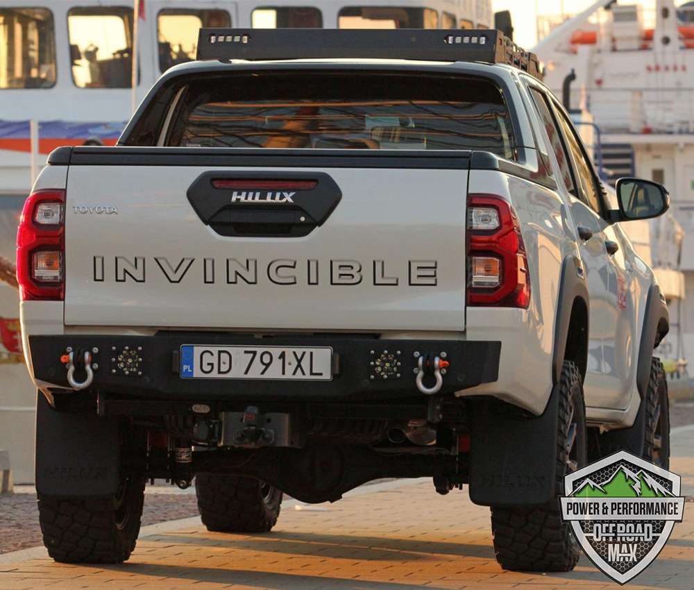 Bara protectie spate pentru Toyota Hilux Revo fabricatie dupa 2020, care este prevazuta si cu posibilitatea montarii unui suport rabatabil de roata rezerva, Hi-Lift si canistra/canistre.