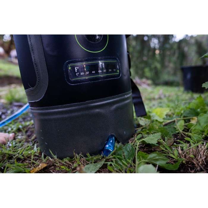 Shower water is delivered through a trigger-spray allowing you to ensure ultimate control over water usage, and even includes a water-level indicator and a handy temperature gauge. The super strong 420D TPU bag stands independently and features carry-handles and even a storage pocket for the shampoo!