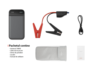 Starter Auto 70MAI 600A Cum se utilizeaza 70mai Jump Starter? Utilizarea dispozitivului ca starter de 12V: 1. Conectati dispozitivul de pornire. Asigurati-va ca indicatorul de pe clemele bateriei este oprit. 2. Conectati clemele bateriei corect la capetele pozitive si negative ale bateriei auto. Clema rosie trebuie conectata la capatul pozitiv (+), in timp ce clema neagra…